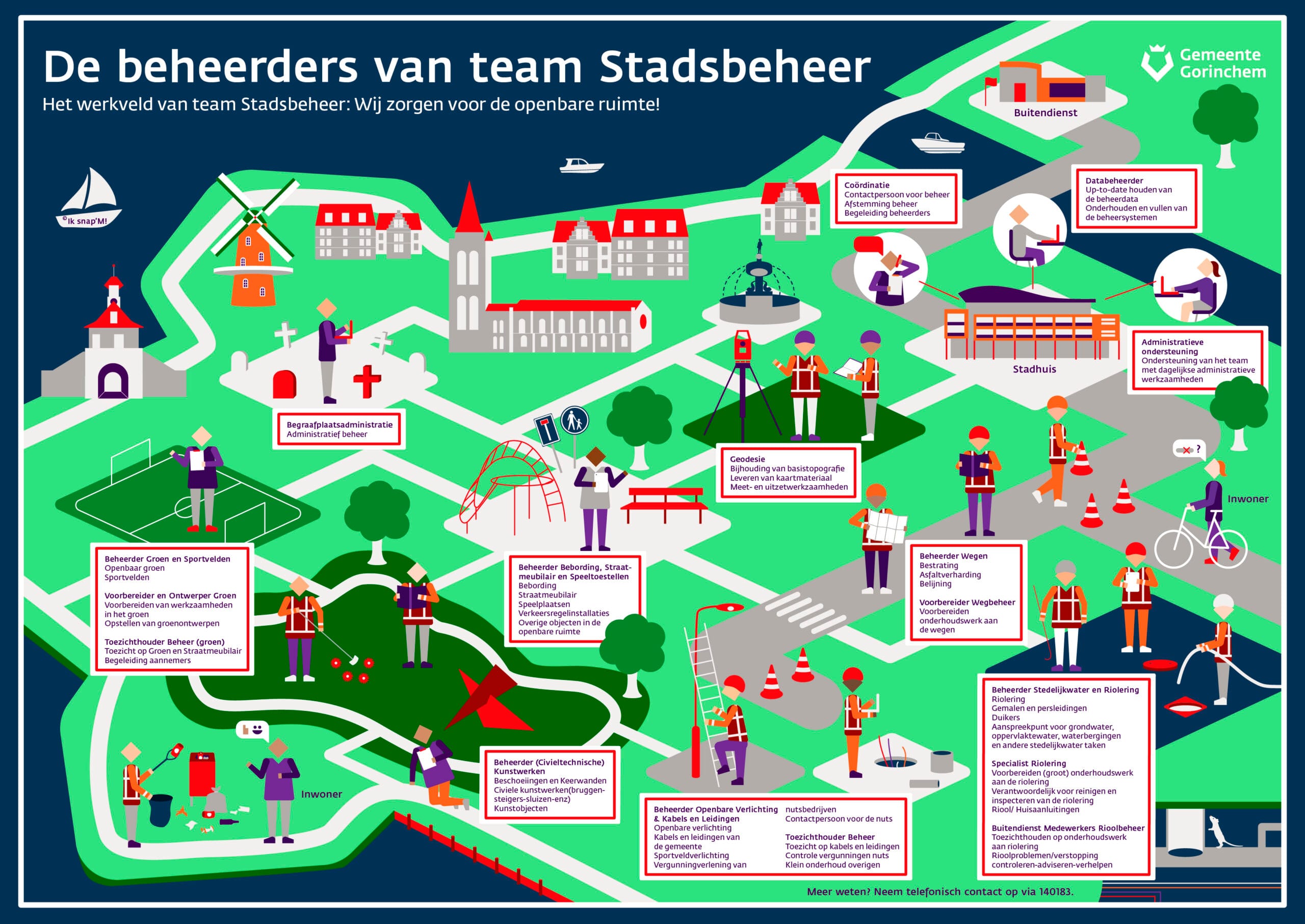 De infographic is gemaakt voor de medewerkers van gemeente Gorinchem, zodat zij weten wie ze waarvoor moeten benaderen. Daarnaast ook voor de bewoners van Gorinchem, om een beeld te geven wat team Stadsbeheer doet.